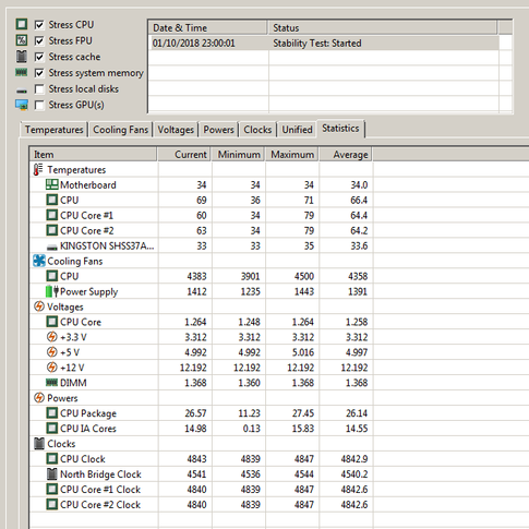 En las Pruebas de Rendimiento utilizamos un programa llamado AIDA64 el cual contiene un programa de Strees que utilizaremos para verificar si existen variaciones en los voltajes tanto en stock como en Overclocking y como podrán apreciar en las pruebas la Fuente soporto un Overclocking de 4.8GHZ de un Core i3 7350K, no hubieron casi variaciones con respecto a los voltajes 3v,5v y 12v manteniendose estable en las pruebas que se realizaron.