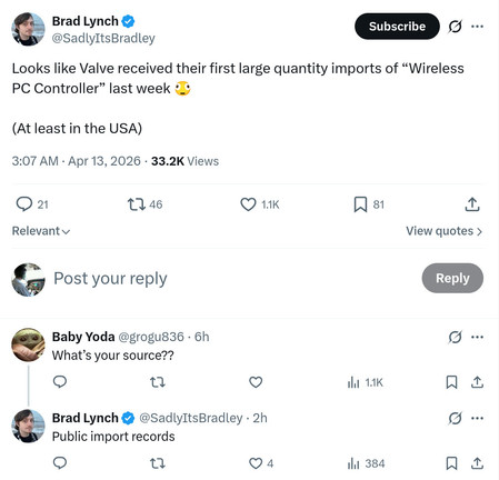 Desde que Valve anunció la Steam Machine, Steam Frame y el nuevo Steam Controller, los jugadores han estado clamando por el lanzamiento del hardware actualizado, especialmente el Steam Controller. Si bien Valve aún no ha anunciado la fecha de lanzamiento o incluso el precio, parece que el gigante de los juegos se está preparando para el lanzamiento de los nuevos controladores en los Estados Unidos. Según el experto de la industria, @SadlyItsBradley en X, los documentos de envío recientes indican que Valve acaba de recibir sus "primeras importaciones de gran cantidad" de un "Controlador inalámbrico de PC", lo que sugiere que la compañía puede estar abasteciendo almacenes en preparación para el lanzamiento del Steam Controller.