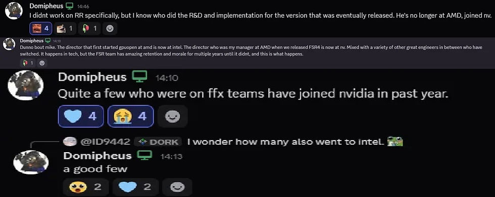 Ahora, según Colin Riley, que se hace llamar Domipheus en Discord, parece que la razón por la que FSR 4 está en este estado podría tener que ver con miembros prominentes del equipo que abandonan la compañía para NVIDIA o Intel.