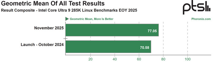 La serie de procesadores "Arrow Lake" Core Ultra 200S de Intel se lanzó hace más de un año, y Categoría: Phoronix Recientemente se realizaron pruebas de Linux para comparar su rendimiento original y consumo de energía con la situación actual. Los resultados son prometedores para las CPU de Intel, que no han sido particularmente populares entre los constructores de PC DIY. De acuerdo con la media geométrica de todos los puntos de referencia, Phoronix encontró que el Intel Core Ultra 9 285K de gama alta ha mostrado una mejora notable del rendimiento de aproximadamente el 9% después de un año de optimizaciones de software.