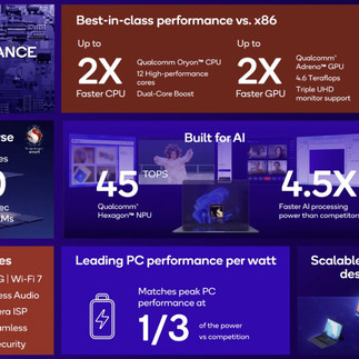 Wccftech ha recopilado los últimos resultados en tablas comparativas. El análisis que lo acompaña afirma: "La CPU Qualcomm Snapdragon X Elite de 12 núcleos fue más rápida que los chips de AMD e Intel en el rendimiento de un solo núcleo, a pesar de que estos dos últimos funcionan a velocidades de reloj mucho más altas, de 5,2 y 5,0 GHz respectivamente. El chip Snapdragon sólo puede mantener una velocidad de reloj máxima de 4 GHz en 1 o 2 núcleos. Todas las pruebas se realizaron en la misma plataforma Windows y no se utilizaron plataformas Linux, aunque puedes encontrar pruebas de Linux compartidas por Benchleaks aquí. Al comparar el rendimiento multinúcleo, la CPU de sobremesa Intel Core i7-12700K es un 4% más rápida, mientras que la CPU AMD Ryzen 9 7845HX es un 5% más rápida. Se trata de un rendimiento multihilo muy impresionante de la arquitectura de CPU Oryon con solo 28 W y el chip de 80 W puede superar fácilmente a los dos competidores. Basándonos en los resultados de rendimiento, podemos ver que el chip se sitúa en una buena posición frente a los otros chips competidores de AMD e Intel. El Intel Core Ultra 9 185H se lleva la palma en las pruebas multihilo, mientras que el Ryzen 9 7940HS, que tiene esencialmente las mismas especificaciones que el 8840HS, queda ligeramente por detrás, pero era de esperar, ya que se trata de un chip de 8 núcleos frente a los 12 núcleos del Snapdragon y los 16 núcleos de Intel".