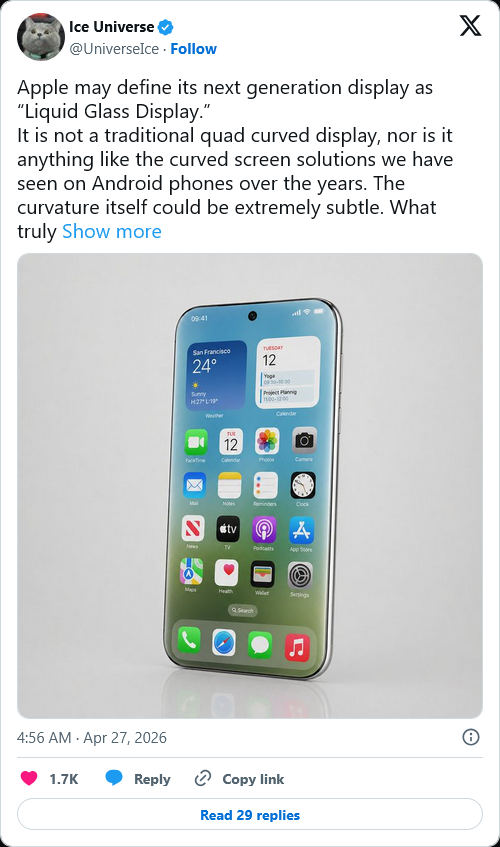 A pesar de que Ice Universe no afirma explícitamente que la nueva pantalla de vidrio líquido de Apple se reservará para su lanzamiento del iPhone en el 20o aniversario, la mención del panel de cuatro curvas sugiere que se atenderá a este lanzamiento específico. En X, el informante escribe que esta pantalla no será como las unidades presentes en los teléfonos inteligentes Android más antiguos, ya que la curvatura podría ser muy "sutil".