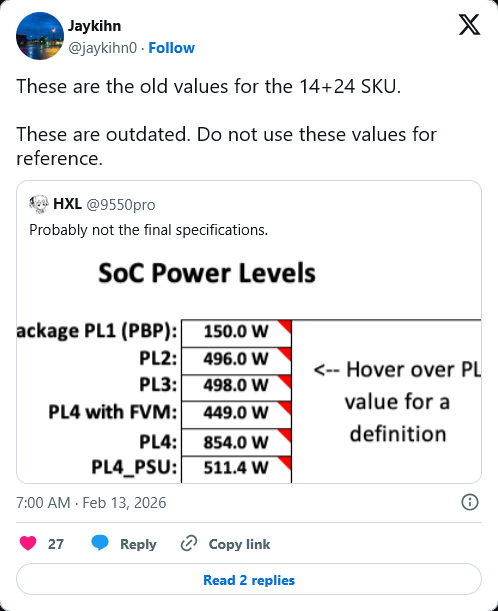 Según la información publicada por HXL, parece que tenemos una mejor comprensión de cuáles podrían ser las configuraciones de PL para las CPUs de escritorio Nova Lake-S. El filtrador afirma que los límites de potencia que se enumeran aquí probablemente no sean definitivos, así que supongamos que estos son valores preliminares. Por otro lado, Jaykihn afirma que estos valores son para un SKU de 14 + 24, no la variante completa de 16 + 32, y son cifras desactualizadas.