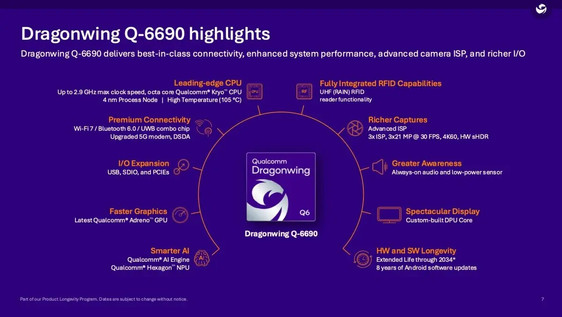 Qualcomm Technologies, Inc. anunció hoy un nuevo procesador innovador, el Qualcomm Dragonwing Q-6690, que es el primer procesador móvil empresarial del mundo con capacidades RFID de UHF totalmente integradas. El procesador incluye 5G integrado, Wi-Fi 7, Bluetooth 6.0, y banda ultra ancha, soportando experiencias de proximidad y conectividad global superior. Diseñado para soportar una amplia gama de factores de forma, desde portátiles robustos hasta sistemas de punto de venta y quioscos inteligentes, el Dragonwing Q-6690 ofrece fabricantes de equipos originales y ODM una plataforma escalable y listo para la actualización con paquetes de características configurables de software que se pueden actualizar sobre el aire.