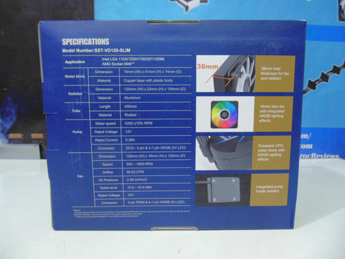 En la parte trasera tenemos la especificación del AIO donde podemos apreciar cada característica de dicho producto y también apreciamos información de algunas mejoras como ser un nuevo diseño de la bomba, incluir un controlar para manejar el ARGB y el nuevo diseño de los ventiladores que nos incluyen en este AIO, por su parte cada información presentada es sumamente completa y se agradece a Silverstone por incluir esos detalles.